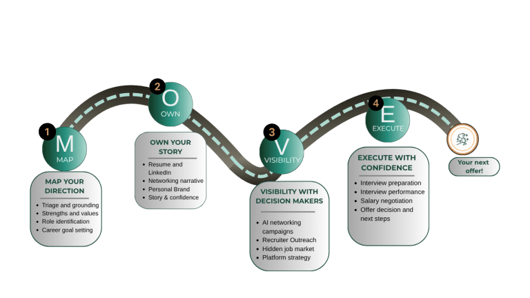 That’s where YourCareerMentor was born. I built the M.O.V.E. Method© to systematize what I’d been doing intuitively for over a decade — a four-stage process that takes clients from clarity to offer, and from overlooked to influential. Built on 300+ hiring decisions, 12+ years of coaching and recruiting experience, and the kind of insider knowledge that changes how a candidate walks into a room. The results followed: 400+ career moves supported, most clients reaching their goal in 3 months or less — 2x faster than the national average.